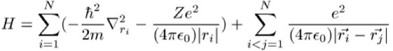 Die erste Summe enthält die kinetische Energie sowie die Coulomb-Wechselwirkung mit dem Atomkern im Abstand ri für jedes Atomelektron i, die zweite Summe beschreibt die Elektron-Elektron-Abstoßung zwischen Elektron i und Elektron j. Näherungsverfahren zur Beschreibung des Mehrelektronenatoms sind u.a. das Thomas-Fermi-Modell, in dem ein effektives Potential mittels statistischer Methoden bestimmt wird; sowie die Hartree-Fock-Näherung, ein auf dem Variationsprinzip basierendes quantenmechanisches Verfahren zur Bestimmung der Gesamtwellenfunktion.