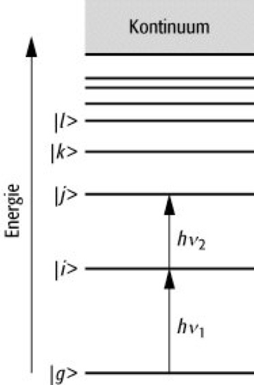 Mehrstufenanregung, Prozeß der Anregung von Atomen oder Molekülen. In Abb. 1 ist der Prozeß anhand der Zwei-Photonen-Anregung eines Atoms aus dem Grundzustand |g〉 in einen angeregten Zustand |j〉 gezeigt, wobei der Zwischenzustand |i〉 angeregt wird. Dies geschieht durch Absorption zweier Photonen der Energien hν1 und hν2. Diese Methode der Anregung wird hauptsächlich in der Laserspektroskopie angewendet, da mit Laserlicht sehr effizient selektiv einzelne atomare Zustände gepumpt werden können.