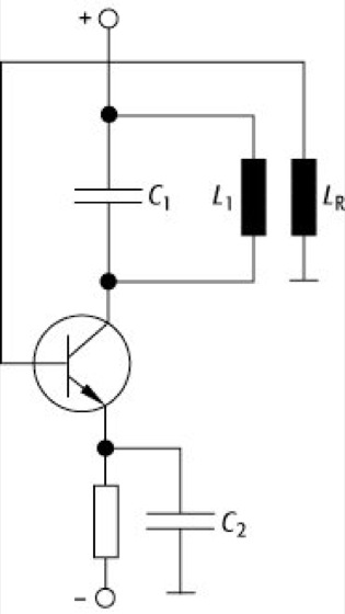 Meißner-Oszillator: Schaltbild: C1 und L1 bilden den Schwingkreis, an den die Spule LR gekoppelt ist.