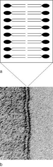 Membranen, biologische: a) Schema der Lipiddoppelschicht. b) Elektronenmikroskopisches Bild eines Membranquerschnittes.