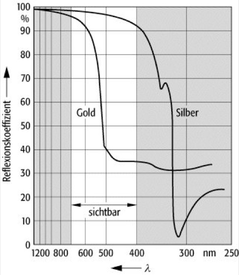 Metalloptik: Reflexionskoeffizienten in % für Gold und Silber im Wellenlängenspektrum von 1 200-250 nm.