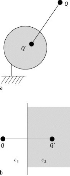 Methode der Spiegelladung: Anwendungen der Methode der Spiegelladung. a) Potential einer Punktladung Q außerhalb einer leitenden Hohlkugel, b) Punktladung Q in Dielektrikum mit ε1 vor einer Grenzfläche zu einem Gebiet mit ε2.