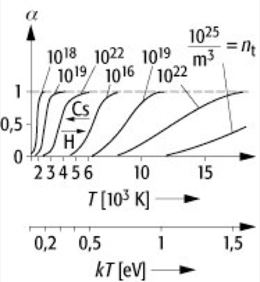 MHD-Generator 2: Ionisationsgrad α von Caesium (Cs) und elementarem Wasserstoff (H) bei verschiedenen Teilchendichten nt als Funktion der Plasmatemperatur T.