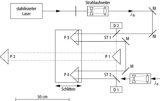 Michelson-Lambdameter: Strahlengang im Michelson-Interferometer (M: Spiegel, P: Prismen, D: Detektoren).