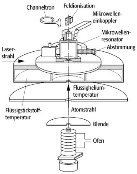 Mikromaser, Anordnung zum Studium der Wechselwirkung zwischen Atomen und Strahlungsfeldern in Mikrowellen-Resonatoren. Die prinzipielle Anordnung ist in der Abbildung skizziert: Alkali-Atome aus einem Atomstrahl werden durch Laseranregung in einen Rydberg-Zustand angeregt (Rydberg-Atome) und passieren dann einen Hohlraumresonator aus Nb, der so weit abgekühlt wird, daß seine Wände supraleitend werden. Durch Druck auf den Resonator kann selbiger in seinen Abmessungen verändert und damit auch die Frequenz der Resonatormoden modifiziert werden (Resonatoren).