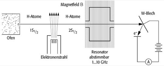 Mikrowellenspektroskopie am Wasserstoff, Anwendung der Mikrowellenspektroskopie auf Messungen von Spektrallinien am Wasserstoff-Atom (H-Atom). Ein berühmtes Beispiel für ein solches Experiment ist die Entdeckung der Lamb-Shift im Jahre 1947 durch Lamb und Retherford. Im H-Atom sollte die Feinstrukturkorrektur nur vom Gesamtdrehimpuls, nicht aber vom Bahndrehimpuls abhängen (Drehimpuls), was eine Entartung der Zustände 22S1/2 und 22P1/2 zur Folge hat (Atomspektrum). Tatsächlich fanden Lamb und Retherford eine Aufspaltung von ca. 900 MHz. Die Anordnung zur Messung dieser Aufspaltung ist in Abb. 1 dargestellt: H2-Moleküle werden in einem Ofen bei ca. 2 500 °C thermisch dissoziiert und durch Elektronenbeschuß in den metastabilen Zustand 22S1/2 angeregt. Diese Atome passieren einen abstimmbaren Mikrowellenresonator und werden dann von einem zustandsselektiven Detektor nachgewiesen. Dieser detektiert nur Atome im angeregten Zustand. Atome, die durch Absorption von Mikrowellenstrahlung in den Zustand 22P1/2 oder 22P3/2 übergehen, zerfallen unter Aussendung elektromagnetischer Strahlung in den Grundzustand. Dieser Übergang ist für Atome im Zustand 22S1/2 verboten. Lamb und Retherford fanden zwei Absorptionslinien bei ca. 900 MHz und 10 GHz. Die Resonanz bei 10 GHz entspricht dem Übergang 22S1/2 nach 22P3/2. Die Resonanz bei 900 MHz wurde mit dem Übergang 22S1/2 nach 22P1/2 in Verbindung gebracht.