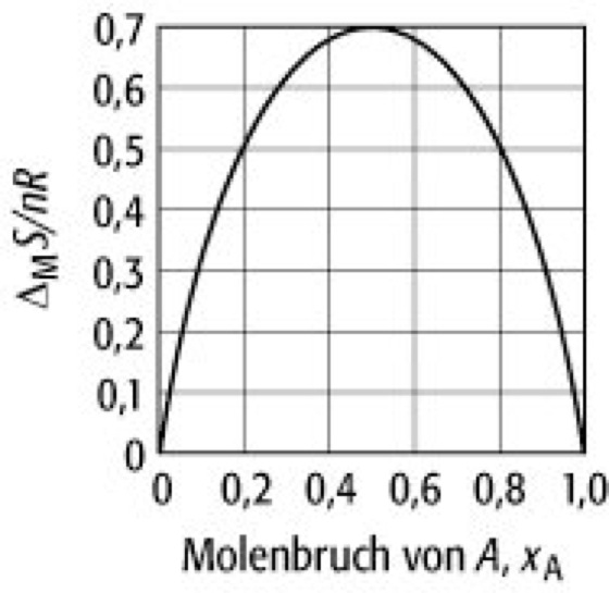 , wobei x der Molenbruch ist. Sie verschwindet für die reinen Substanzen und hat bei x = 0,5 ihr Maximum.