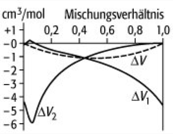 Statt des partiellen wird bisweilen das etwas anders definierte scheinbare Molvolumen benutzt, das leichter gemessen werden kann. Die Abb. läßt erkennen, wie unregelmäßig sich die Änderungen der partiellen Molvolumina ΔV1 und ΔV2 und die Änderungen des Gesamtvolumens ΔV mit wechselndem Mischungsverhältnis verhalten können.