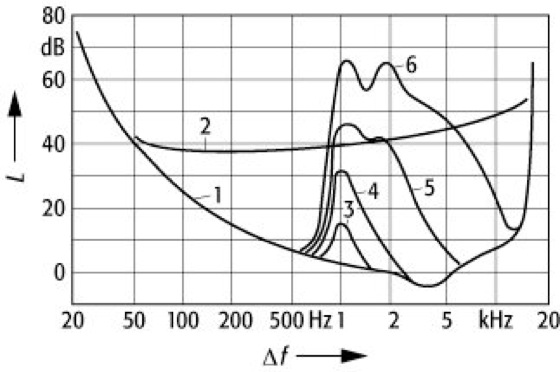 Mithörschwelle: Mithörschwellen für reine Töne bei Verdeckung durch unterschiedliche Signale; 1: Hörschwelle; 2: Mithörschwelle von weißem Rauschen (LWR = 20 dB); 3, 4, 5, 6: Mithörschwellen eines 1000-Hz-Tones (Lp = 30, 50, 70 und 90 dB).