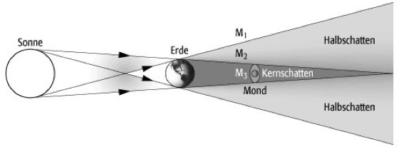 Mondfinsternis: Geometrie von Mondfinsternissen. Eine Mondfinsternis kann in drei Zeitabschnitte unterteilt werden. Bewegt sich der Mond im Gebiet M1, so befindet er sich außerhalb des Erdschattens. Tritt er in den Bereich M2 ein, beginnt die Finsternis. Vom Mond aus gesehen verdeckt jetzt die Erde einen Teil der Sonne. Befindet sich der Mond im Gebiet M3, ist die Finsternis total.