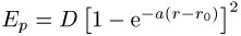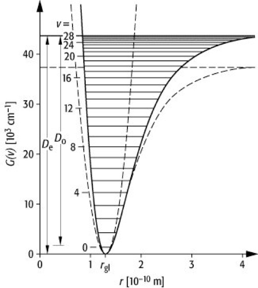 (D ist die Dissoziationsenergie der Bindung zwischen beiden Atomen oder Tiefe des Potentialminimums, r ist der Molekülabstand, r0 der Gleichgewichtsabstand der Atome, a ist eine für die Krümmung der Energiekurve maßgebende Konstante mit dem Wert a = (μ / 2D)1 / 2ν0; μ ist die reduzierte Masse des Systems, ν0 die Grundfrequenz des Moleküls). Wenn man die Morse-Funktion als potentielle Energie in der Schrödinger-Gleichung verwendet, dann entsprechen die für den Oszillator erhaltenen Energieniveaus jenen des anharmonischen Oszillators (Anharmonizität). Der Abstand dieser Energieniveaus ist nicht äquidistant, sondern wird mit zunehmender Quantenzahl v kleiner. Die Abnahme des Abstandes zwischen aufeinanderfolgenden Niveaus ist dabei konstant. Die Anzahl der Niveaus bis zur Dissoziationsgrenze ist endlich. In der Abbildung ist die Morse-Funktion graphisch aufgetragen. Man erkennt, daß sich die beiden Atome selbst bei großer Schwingungsenergie und damit sehr großer Schwingungsamplitude nicht beliebig weit nähern können. Die Coulomb-Abstoßung zwischen den beiden Atomkernen verhindert dies. Weil der rechte Ast der Potentialkurve in eine Horizontale übergeht, kann es bei hoher Schwingungsanregung zu einer Dissoziation des zweiatomigen Moleküls kommen. Die Energiedifferenz zwischen dem Minimum der Kurve und dem horizontalen Ast ist gleich der Dissoziationsenergie. Oberhalb der Dissoziationsenergie ist die Energie nicht mehr gequantelt. Dort liegt ein Energiekontinuum vor.