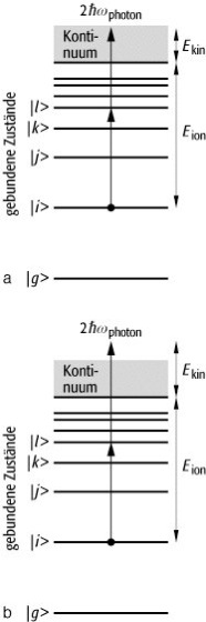 Man unterscheidet im wesentlichen zwei Formen der MPI: 1) Bei der resonanten MPI wird mindestens einer der Zwischenzustände resonant angeregt (siehe Abb. 1b für die Zwei-Photonen-Ionisation). Dabei regt das erste absorbierte Photon den Zwischenzustand