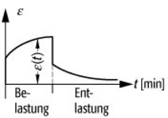 Nachwirkung: Zeitabhängiger Dehnungsverlauf ε(t) eines viskoelastischen Materials: Die Dehnung verzögert sich und strebt gegen einen asymptotischen Grenzwert.