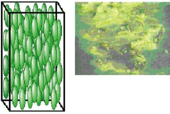 nematische Phase 2: Schemazeichnung (links) und Photographie (rechts) der nematischen Phase eines Flüssigkristalls.