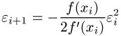 Bei Wahl eines geeigneten Startwertes kann das Verfahren konvergieren; wenn es konvergiert, so tut es dies mit quadratischer Konvergenzordnung, d.h. der Fehler