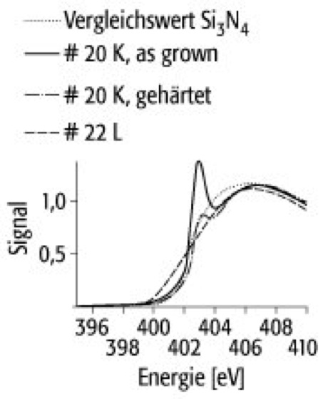 NEXAFS: NEXAFS-Analyse von N-reichen SiOxNy-Filmen. Die N-Resonanzlinie bei 403 eV ist erklärbar durch N-Überschuß in den auf Wafer-Silicium aufgesputterten (Sputtern) SiOxNy-Schichten. Schichtzusammensetzung der Proben: Vergleichswert Si3N4: 57 % N; 20 L: Si 27 %, N 27 %, O 34 %, H 12 %; 22 K: Si 36 %, N 30 %, O 18%, H 15 %). Die Elementkonzentrationen wurden mittels Ionenstrahlanalyse ermittelt. Der N-Überschuß in der as-grown-Probe 20 K ist durch 30minütige Temperung der Probe bei 530° C signifikant zu reduzieren (20 K, gehärtet).