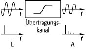 nichtlineare Verzerrungen: Beispiel (E: Eingangssignal, A: Ausgangssignal).