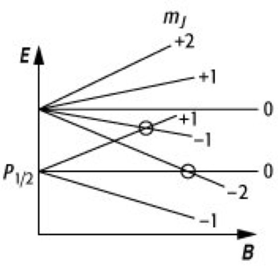 Niveaukreuzungsspektroskopie: Termschema eines Atoms mit Zuständen J = 1 / 2 und J = 2 im Magnetfeld B. Die Kreise markieren Niveaukreuzungen.