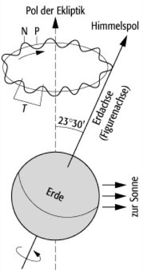 Nutation: Überlagerung von astronomischer Nutation (N) und Präzession (P) der Erde (T: Periode).