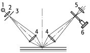 Oberflächenprüfverfahren, optisches: 1 Quelle, 2 Kondensor, 3 Spalt, 4 Objektiv, 5 Okular, 6 Meßschraube.