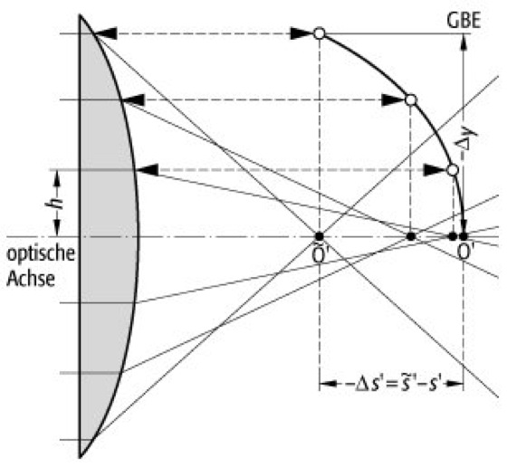 Öffnungsfehler 1: Öffnungsfehler einer Konvexlinse: GBE: Gaußsche Bildebene, -Δs': Längsabweichung, -Δy': Querabweichung.