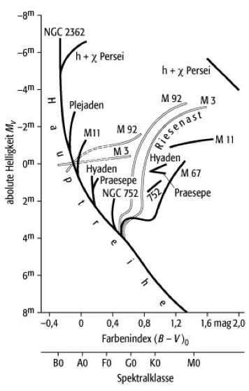 offene Sternhaufen 1: Schematisches Farben-Helligkeits-Diagramm einiger offener Sternhaufen. Der Abknickpunkt der Hauptreihe wandert von sehr jungen Haufen, wie den Plejaden, herunter zu den ältesten Haufen, wie M67. M3 und M92 sind alte Kugelsternhaufen.