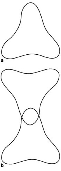 Oktupol: Homogene Ladungsverteilung mit Oktupolmoment; a) statische Verteilung, b) symmetrisierte Überlagerung aus zwei solchen Zuständen.