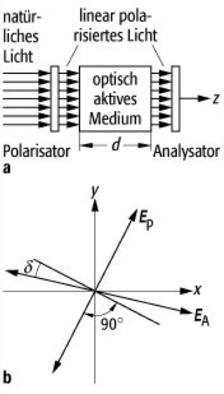 optisch aktive Kristalle: a) Meßanordnung zur Bestimmung des Drehvermögens optisch aktiver Substanzen; b) Stellung der Durchlaßrichtung Epdes Polarisators zur Durchlaßrichtung EA des Analysators bei Dunkelheit hinter dem Analysator.