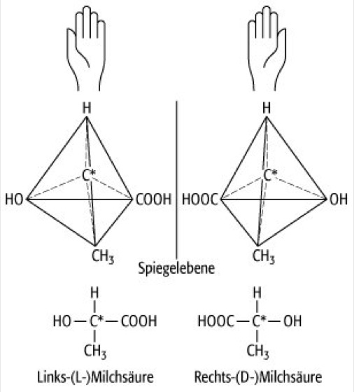optisch aktive Materialien: Beispiel für rechts- und linksdrehende Varianten eines spiegelbildisomeren Moleküls: Die Strukturen der optisch isomeren Rechts- und Linksmilchsäure können nicht zur Deckung gebracht werden – wie die rechte und die linke Hand.