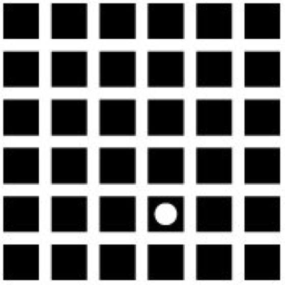 Kontrasttäuschungen werden durch die Verarbeitung des Sehreizes in der Netzhaut hervorgerufen. Sie bewirken normalerweise die verstärkte Wahrnehmung von Kontrasten und machen sich in Fehlinterpretationen der Hell-Dunkel- oder Farbwahrnehmung bemerkbar (Farbe und Farberscheinungen). Bei der Hermannschen Gittertäuschung (Abb. 4) etwa bemerkt man an den Kreuzungspunkten der weißen Linien graue Flecken. Der Grund hierfür ist, daß Stellen auf den weißen Linien von mehr schwarzen Bereichen umgeben sind als Stellen an den Kreuzungen. Dieser Kontrast wird verstärkt, und die Linien erscheinen hell weiß, die Kreuzungspunkte dagegen grau. In der Nähe des durch die weiße Kreisfläche aufgehellten Quadrates verschwinden die grauen Flecken.