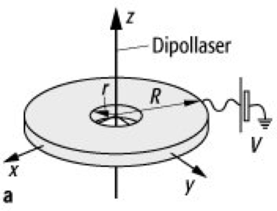 optoelektrische Atomfalle, Anordnung zur Speicherung von Atomen. Dabei wird an eine Ringelektrode ein Potential von typischerweise 12 kV angelegt, wie in Abb.a gezeigt. Das resultierende elektrische Feld, dessen Verlauf in z-Richtung quadratisch in Abb.b dargestellt ist, verursacht durch den quadratischen Stark-Effekt eine ortsabhängige Kraft auf Atome, die die Gravitationskraft in einem bestimmten Abstand von der Elektrode kompensiert. Zusätzlich werden die Atome im Fallenvolumen mit einem rot-verstimmten Laser bestrahlt, was auf Grund der Dipolkraft eine zusätzliche Kraft bewirkt. Das resultierende Potential für Cs-Atome, die mit einem Laser der Frequenz 853 nm bestrahlt werden, ist in Abb.c dargestellt. Damit konnten Lemonde und Mitarbeiter 1995 bis zu 2,5 · 105 Atome, die zunächst magnetooptisch eingefangen wurden, bis zu einer Sekunde lang speichern.