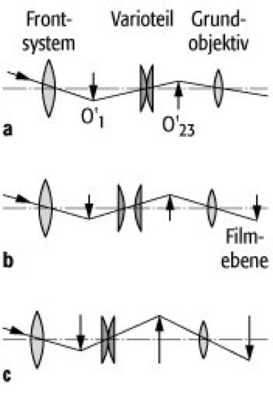 Da die Einhaltung der Schärfe durch den relativen mechanischen Abstand l der Teilsysteme erreicht wird, bezeichnet man diese Art als mechanisches System (siehe Abb.). Durch Verschiebung des Frontsystems bleibt die Lage der Bildebene O'1 unverändert für die verschiedenen Entfernungen. Die Zwischenabbildung von O'1 nach O'23 findet durch den Varioteil mit verändertem Abbildungsmaßstabβ statt. Damit die Lage von O'23 fest bleibt, müssen zwei Bedingungen für β erfüllt sein (der Index von β bezieht sich auf die jeweilige Abb.1). i) βa 1 bzw. βc = 1 / βa: der Abstand zwischen den Linsen des Variosystems ist so klein, daß sie wie eine Linse wirken. ii) βb = -1: hier muß der Ausgleich durch einen Abstand zwischen den Linsen des Variosystems erreicht werden.