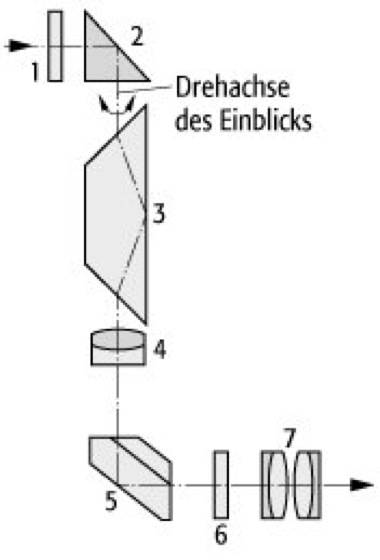 Periskop, Sehfernrohr, Sehrohr, Bauform eines Fernrohres, bei dem mittels Reflexionsprismen und Spiegeln der Strahlengang parallel versetzt werden kann. Ein Beispiel für ein Periskop ist das Panoramafernrohr, das eine konstante horizontale Einblicksrichtung erlaubt (siehe Abb.). Hierbei lenkt ein Halbwürfel das einfallende Licht in vertikaler Richtung ab und durch ein Dove-Prisma wird die Bilddrehung kompensiert. Ein weiterer Halbwürfel mit Dachkante (Dachkantprisma) erzeugt im Zusammenspiel mit Fernrohr und Objektiv ein seitenrichtiges und vergrößertes Bild. Durch den Einbau einer zusätzlichen Feldlinse kann wie z.B. beim U-Boot-Periskop ein Achsenabstand von einigen Metern erreicht werden, so daß durch die Drehung des gesamten Periskopes die abschnittsweise Beobachtung des Raumes oberhalb der Wasseroberfläche möglich ist.