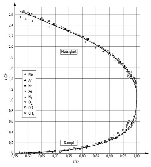 Die Kontinuität der Zustände am kritischen Punkt wird in Abb. 3 für verschiedene einkomponentige Substanzen beispielhaft gezeigt. Bei Temperaturen unterhalb der kritischen Temperatur TC koexistieren Flüssigkeit und Dampf mit verschiedenen Dichten. An der wohldefinierten Grenzfläche zwischen beiden Phasen tritt ein Dichtesprung auf, der entlang der Dampfdruckkurve immer kleiner wird und am kritischen Endpunkt ganz verschwindet. Da es jenseits des kritischen Punktes keinen Unterschied mehr zwischen der flüssigen und der gasförmigen Phase gibt, ist es daher durch eine entsprechende Prozeßführung möglich, eine Flüssigkeit reversibel zu verdampfen, ohne eine Koexistenzlinie zu kreuzen. Andererseits ist es nur für Temperaturen unterhalb des kritischen Punktes möglich, ohne Kühlen allein durch Erhöhung des Drucks die Dampfphase zu verflüssigen. Dies ist von großer praktischer Bedeutung, da Substanzen mit niedrigen kritischen Temperaturen (z.B. He mit TC = 5,2 K) somit schwer verflüssigbar sind.