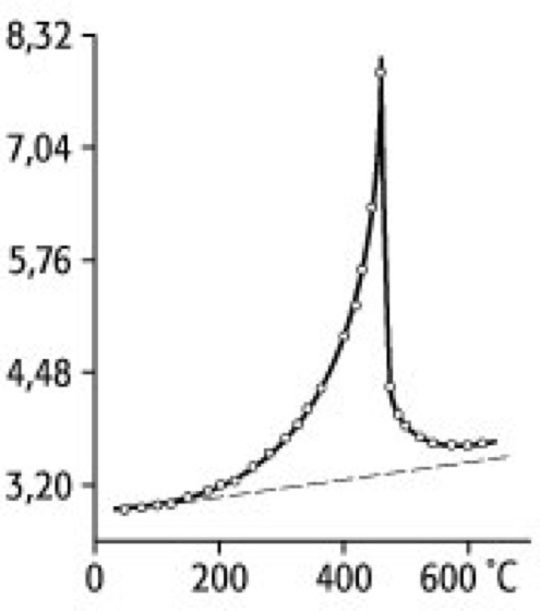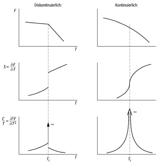 Ein früher Versuch der systematischen Klassifikation von Phasenübergängen wurde 1925 von P. Ehrenfest unternommen, der ein Ordnungsschema vorschlug, in dem zwischen Phasenübergängen erster, zweiter, dritter etc. Ordnung unterschieden wurde. Dieses Schema ist heute überholt; es soll hier jedoch trotzdem erwähnt werden, weil es den Sprachgebrauch bei Phasenumwandlungen nachhaltig geprägt hat. Die Ehrenfestsche Klassifikation stellt eine Verallgemeinerung der Eigenschaften diskontinuierlicher Phasenübergänge dar, die dort Phasenübergänge erster Ordnung heißen. Die Bezeichnungsweise rührt daher, daß bei diesen Umwandlungen die freie Energie zwar stetig verläuft, jedoch am Umwandlungspunkt einen Knick aufweist, so daß die ersten Ableitungen der freien Energie unstetig sind. Die latente Wärme ergibt sich dann beispielsweise aus dem Sprung in der Entropie etc. Um auch Umwandlungen ohne latente Wärme beschreiben zu können, wurde deshalb ein Phasenübergang n-ter Ordnung so definiert, daß im Umwandlungspunkt die freie Energie und ihre Ableitungen bis zur (n – 1)-ten Ordnung stetig sind, während die n-te Ableitung unstetig ist. Bei Phasenübergängen zweiter Ordnung würde man also erwarten, daß die Entropie sich stetig verhält, während die spezifische Wärme einen endlichen Sprung aufweist. Es hat sich jedoch experimentell herausgestellt, daß bei kontinuierlichen Umwandlungen die spezifische Wärme um so größer wird, je näher man an den kritischen Punkt kommt ( Abb. 4 zeigt ein typisches Beispiel). Derartige Singularitäten sind charakteristisch für kontinuierliche Umwandlungen. Man beachte, daß die spezifische Wärme schon weit vor dem eigentlichen Phasenübergang anzusteigen beginnt. Auf Grund der Kurvenform, die an den griechischen Buchstaben λ erinnert, heißen solche Phasenumwandlungen in der älteren Literatur auch λ-Übergänge. Da Phasenübergänge dritter und höherer Ordnung nie beobachtet wurden, unterscheidet man heute nur noch zwischen diskontinuierlichen und kontinuierlichen Phasenumwandlungen. Die Ausdrucksweise ›Phasenübergang von erster (bzw. zweiter) Ordnung‹ ist jedoch fest eingebürgert und wird mittlerweile synonym für diskontinuierliche (bzw. kontinuierliche) Umwandlungen benutzt. Ihre Charakteristika sind in Abb. 5 gegenübergestellt.