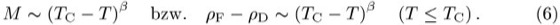 Phasenübergänge am kritischen Punkt können auch unter dem Aspekt betrachtet werden, daß sich unterhalb der kritischen Temperatur TC spontan eine gewisse makroskopische Ordnung ausbildet. Diese Ordnung wird dann durch einen Ordnungsparameter beschrieben, dessen thermodynamischer Mittelwert oberhalb von TC Null ist, unterhalb von TC dagegen endliche Werte annimmt. Die Identifizierung des richtigen Ordnungsparameters ist nicht immer trivial; bei Ferromagneten ist es jedoch nicht überraschend, daß die Magnetisierung die Rolle des Ordnungsparameters spielt. Bei Fluiden wird die Differenz der Dichten von Flüssigkeit und Dampf zur Definition eines Ordnungsparameters herangezogen (siehe Abb. 3 ). Bei Annäherung an den kritischen Punkt geht der Ordnungsparameter stetig gegen Null und folgt dabei einem Potenzgesetz: