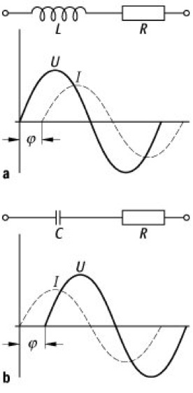 voraus (L: Induktivität, R: ohmscher Widerstand), b) am Beispiel des kapazitiven Kreises: Der Strom I eilt der Spannung U um den Phasenwinkel