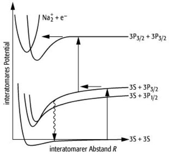 Photoassoziation: Schematische Darstellung bindender Potentialkurven für Stöße zweier Natrium-Atome für verschiedene Feinstrukturzustände der beiden Atome. Aufgetragen ist das interatomare Potential in Abhängigkeit vom Abstand der Atome. Je nachdem, bei welchem interatomaren Abstand die Atome angeregt werden, können sich verstärkt Moleküle bilden.