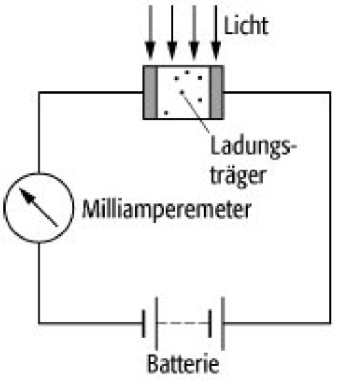 Photoleiter, Photowiderstand, ein sperrschichtloser Halbleiterwiderstand mit zwei ohmschen Kontakten, dessen Widerstandswert sich durch die Erzeugung von Elektron-Loch-Paaren durch auftreffendes Licht (Photonen) ändert. Hierzu muß die Energie des Photons mindestens gleich der Energielücke sein. Die Widerstandsänderung wird in einem geschlossenen Stromkreis mit einer Hilfsquelle als Spannungs- oder Stromänderung registriert. Sie kann sehr große Werte annehmen, z.B. bei einem Photoleiter aus CdS 106-107 Ω bei Dunkelheit und 100-3 500 Ω (je nach Typ) bei Bestrahlung mit 1 000 lx. Im sichtbaren Spektralbereich bestehen Photoleiter aus CdS oder CdSe. Ihre Empfindlichkeit ist sehr hoch. Sie besitzen jedoch ein schlechtes zeitliches Verhalten mit Ansprech- und Erholzeiten im ms- bis s-Bereich. Im Infraroten werden Halbleiter wie PbS, InSb oder HgxCd1-xTe verwendet, die geringere Empfindlichkeiten, aber ein schnelleres zeitliches Verhalten zeigen. Sie müssen z.T. zur Vermeidung der thermischen Erzeugung der Ladungsträger bei tiefen Temperaturen betrieben werden.