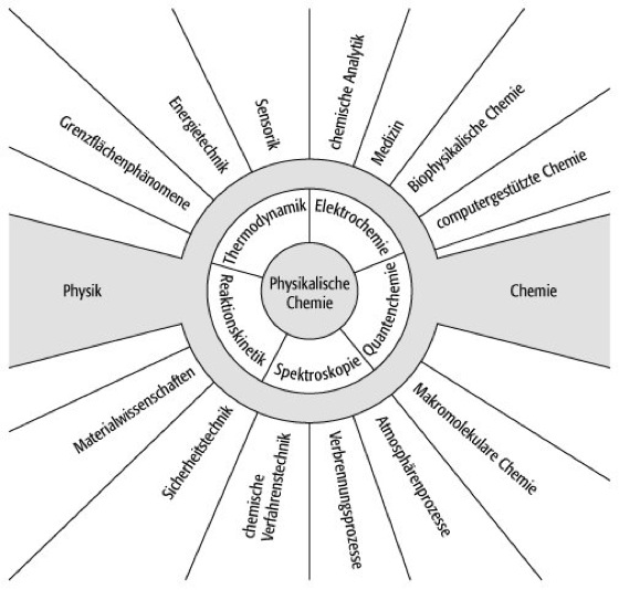 Die PC unterteilt sich – eingebettet zwischen Physik und Chemie – in fünf Kernbereiche (siehe Abb.): 1. die Thermodynamik und 2. die Reaktionskinetik, die Informationen über die Lage chemischer Gleichgewichte, über Phasengleichgewichte und über die Geschwindigkeit von Stoffumwandlungen beisteuern; 3. die Elektrochemie, die besondere Bedeutung für die Energietechnik und die Sensorik hat; 4. die Spektroskopie, die für die Prozeß- und Produktanalytik sowie für die Untersuchung von Material- und Grenzflächeneigenschaften eine bedeutende Rolle spielt, und 5. die Quantenchemie, mit deren Hilfe sich ein sehr genaues Bild der chemischen Bindung, der molekularen Struktur und der Dynamik kleiner Moleküle bzw. der Struktur-Wirkungs-Beziehungen größerer Moleküle (Molecular Modelling) ableiten läßt.