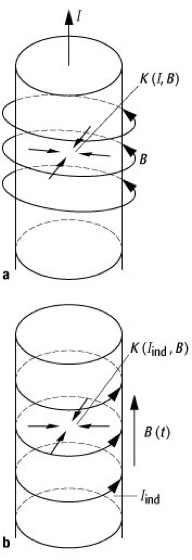 Pinch-Effekt: Feldlinien und wirkende Kraft beim Pinch-Effekt; a: Z-Pinch, b: θ -Pinch.