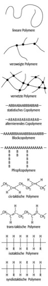 Die Primärstruktur der Polymere (Konfiguration) wird bestimmt durch die Verknüpfung der benachbarten Monomere (siehe Abb.). In Abhängigkeit von der Anordnung der Grundbausteine werden lineare, verzweigte und vernetzte Polymere unterschieden. Der einfachste Fall ist die lineare Kette wie beim Polyethylen. Besteht ein Polymer aus einem einheitlichen Grundbestandteil, wird es als Homopolymer bezeichnet. Geringe strukturelle Abweichungen an den Kettenenden oder den Verzweigungen werden dabei toleriert. Kopolymere (Heteropolymere) bestehen aus verschiedenen Grundbestandteilen. Bei den Kopolymeren wird zwischen statistischen und alternierenden Kopolymeren unterschieden. Besondere Formen von Kopolymeren sind Blockkopolymere, bei denen die Grundbestandteile A und B längere Folgen in der Hauptkette bilden (z.B. A-A-A-B-B-B-B-A-A-A-B-B-B-B) und Pfropfkopolymere (Graftcopolymers), bei denen an die aus dem Grundbestandteil A bestehende Hauptkette Nebenketten aus dem Grundbestandteil B angesetzt sind.