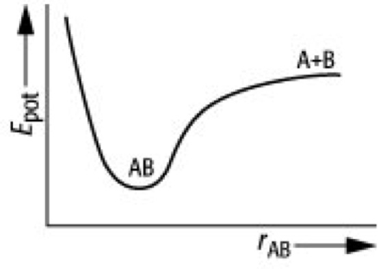 Potentialkurve, eine graphische Darstellung, die die Abhängigkeit der Abstoßungs- und Anziehungskräfte zwischen Atomen – wie z.B. in einem zweiatomigen Molekül AB – vom Abstand der Atomkerne wiedergibt (siehe Abb.). Bei größerem Abstand rAB überwiegt die Anziehung, weil sich die Bindungselektronen an beiden Atomen aufhalten können. Dadurch sinkt die potentielle Energie. Bei kleinem Abstand dominiert dagegen die Coulomb-Abstoßung der beiden Kerne (z. B. Born-Mayer-Potential). Im Minimum der Potentialkurve bei r0 sind beide Kräfte gleich groß, d.h. es liegt eine stabile chemische Bindung vor (Bindungsenergie, Bindungslänge). Mit wachsendem Kernabstand nehmen die Austauschwechselwirkungen (Austausch) der bindenden Elektronen ab, bis das Molekül in Atome dissoziiert (Dissoziation, Dissoziationsenergie).