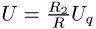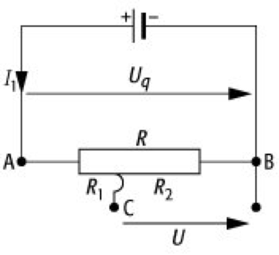 Potentiometer: Zwischen dem ›Schleifer‹ C und dem Bezugspunkt B kann jeder beliebige Bruchteil der vorgegebenen Spannung Uq abgegriffen werden. Die Teilspannung U berechnet sich dann zu: