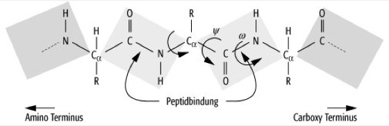 ). R bezeichnet die Aminosäureseitenkette. Die Dihedralwinkel φ und ψ, definiert durch die Atome C'i-1NiiC'I und NiiC'i Ni+1 beschreiben die relativen Lagen der Peptidgruppen. Im φ-ψ-Diagramm (Ramachandran-Karte) kann man sterisch erlaubte (infolge der endlichen Radien der Atome) Konformationen eines Aminosäurerestes innerhalb der Polypeptidkette illustrieren.