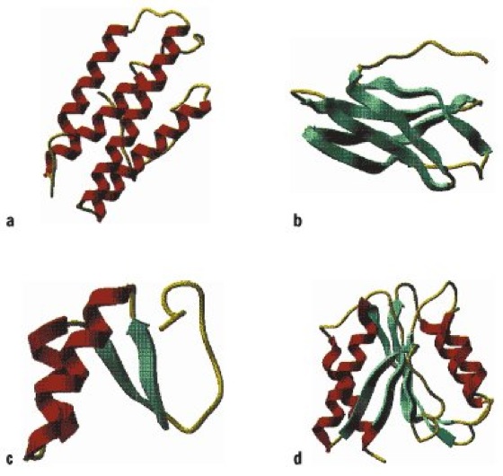 Proteine 2: Beispiele für Proteinfolds: a) rein α-helikales Protein, Myohemerythrin (PDB-Code 2MHR), 4-Helix-Bündel; b) reine β-Faltblattstruktur, Glycosidase Inhibitor (PDB-Code 1HOE), β-Sandwich; c) α + β-Struktur, Crambin (PDB-Code 1CRN); d) α / β-Struktur, Flavodoxin (PDB-Code 2FX2).