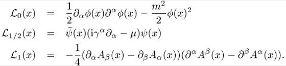 Der Formalismus der Quantenfeldtheorie hat als Ausgangspunkt die Lagrange-Dichten für freie Spin-0-, Spin-1 / 2- und Spin-1-Teilchen,