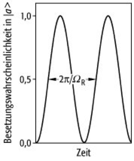 Rabi-Oszillationen, Phänomen der periodischen Umbesetzung zweier atomarer Energiezustände unter Wechselwirkung mit kohärenter, resonanter elektromagnetischer Strahlung. In Reinform liegt diese Oszillation in einem Zwei-Niveau-System vor (siehe Abb. 1). Abb. 2 zeigt den Verlauf der Besetzungswahrscheinlichkeit des angeregten Zustands