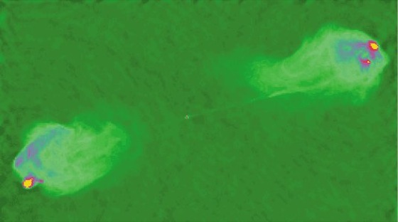 Radiogalaxien: Falschfarbendarstellung der Radiogalaxie Cygnus A, aufgenommen im Radiobereich mit dem Very Large Array, New Mexico. (Foto: NRAO/VLA)