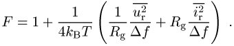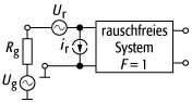 . F ist keine konstante Kenngröße eines Systems, sondern hängt von der Eingangsbeschaltung ab. Der Einfluß der Ausgangsbeschaltung kann bei fehlender Rückwirkung auf den Eingang vernachlässigt werden. Zur Berechnung dieser Abhängigkeit wird das mit Rauschen behaftete System durch ein rauschfreies System ersetzt, und die internen Rauschquellen werden als eine Rauschspannungsquelle mit der Rauschspannung ur und eine Rauschstromquelle mit dem Rauschstrom ir an den Eingang verlegt. Das Rauschen der Signalquelle wird vereinfachend als das thermische Rauschen ihres Innenwiderstandes Rg angenommen. Dann ist
